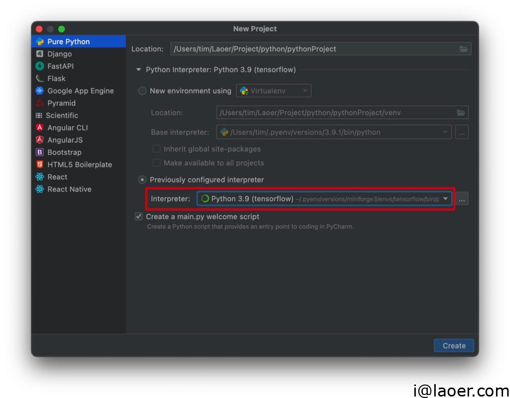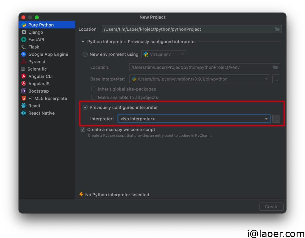 在“New Project”的窗口中,即可以选择我们刚才创建的“Interpreter”,点击“Create”,项目创建成功。