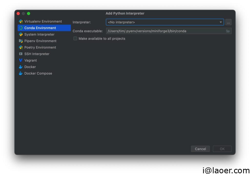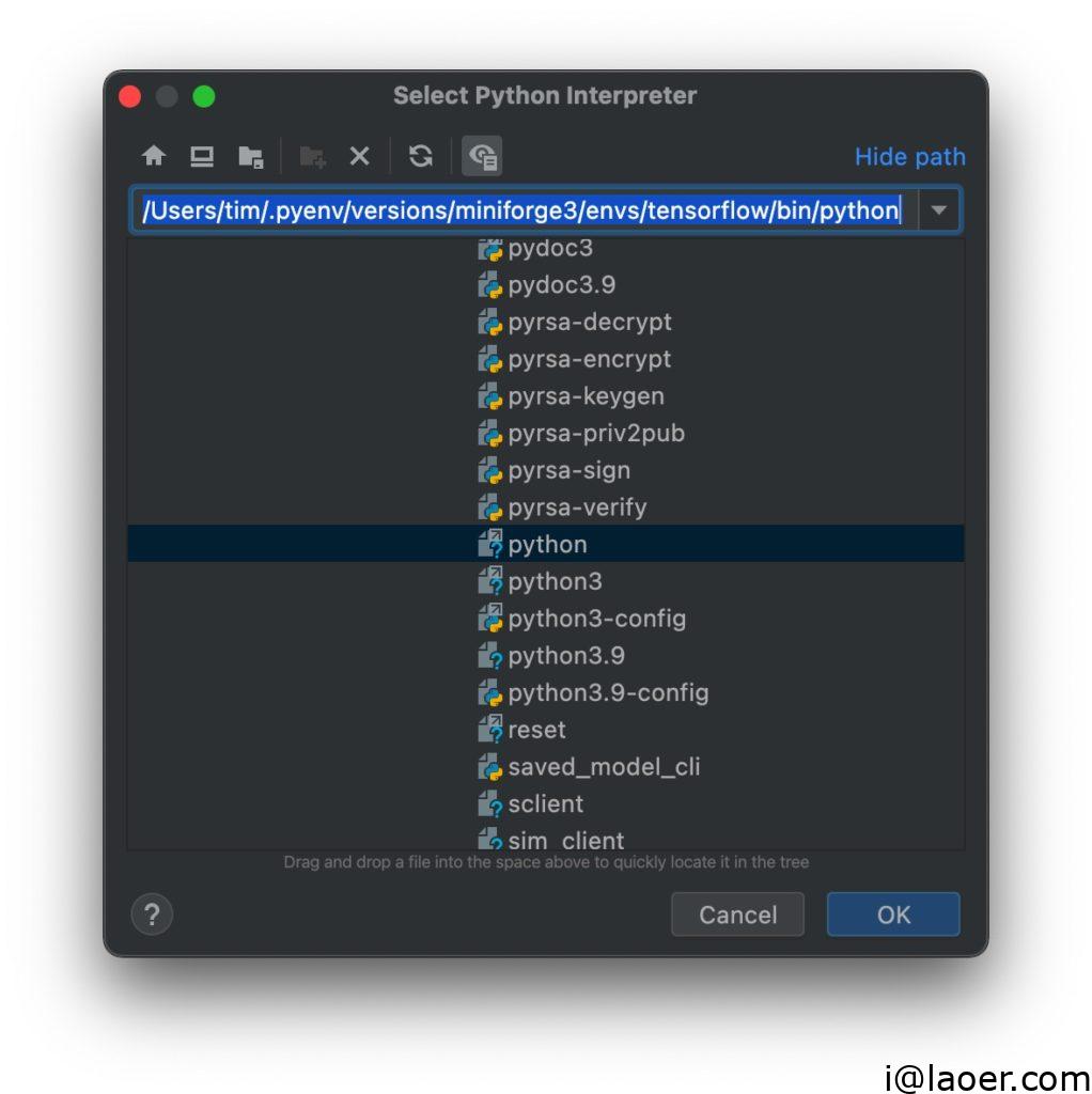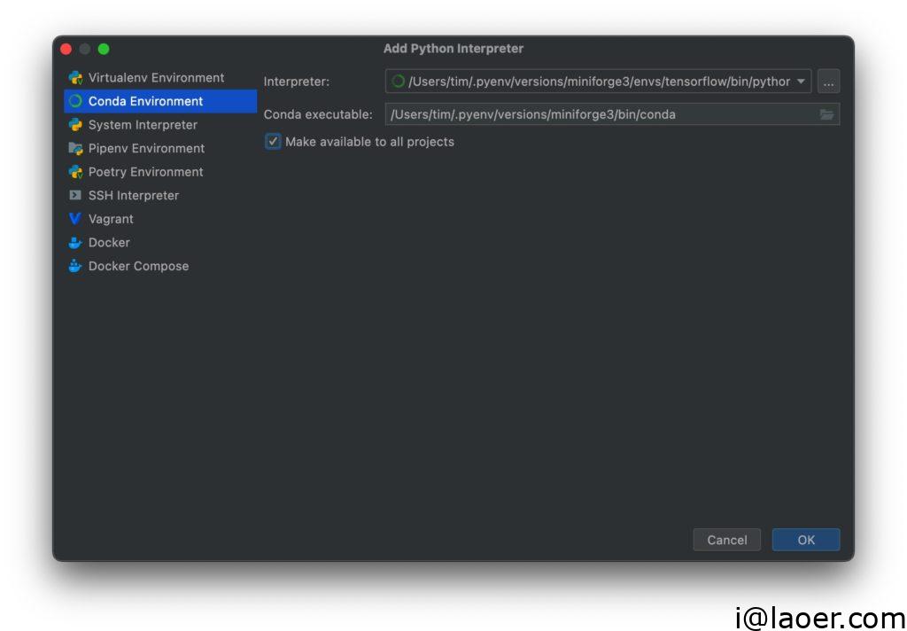 选择miniforge3下“tensorflow”这个虚拟环境下的python文件地址,点击“OK”